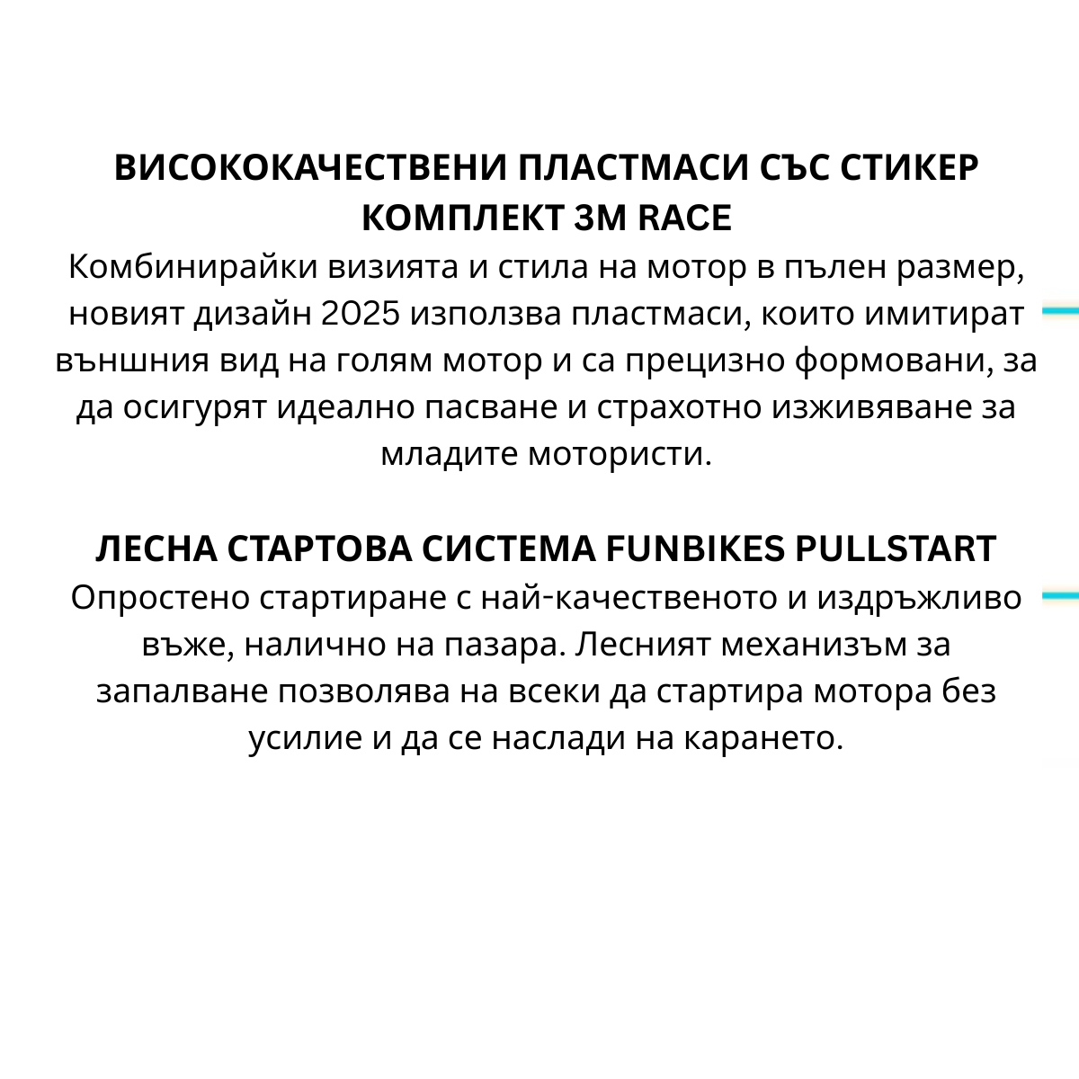 - Два пъти по-силен от стандартните 49cc мотори. Достатъчно мощен да тегли и възрастен, подходящ за следваща стъпка към истински кросов мотор.