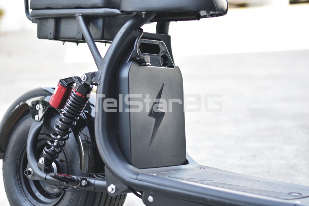 | Допълнителна информация | START/STOP бутон - двойна задна седалка - предна амортисьорна вилка - телескопични задни амортисьори с големи въздушни цилиндри - дисплей с показание за ниво на батерия, скорост, пробег, моментно напрежение на двигателя, светлини, скорости и др. - пълна светлинна окомплектовка- LED преден фар + габарит, стоп, мигачи - клаксон * Важно: скутера има допълнителен слот под краката с инсталация за поставянето на втора батерия за по- дълъг пробег *Само сега, при закупуване на скутера получавате безплатно и: - USB за зареждане на мобилни устройства - стойка държач за мобилни сутройства - 2 бр. дистанционни с аларма Допълнителни опции: * опция за допълнителна батерия 13Ah +550лв. (+35км. пробег) * опция за допълнителна батерия 21Ah + 750лв. (+60-70км. пробег) |