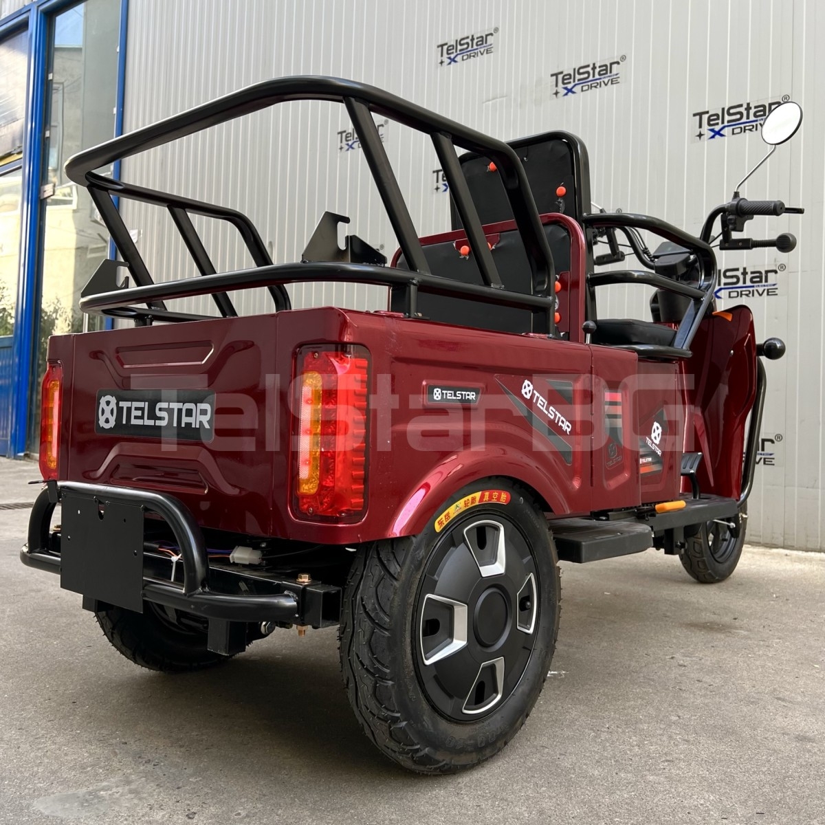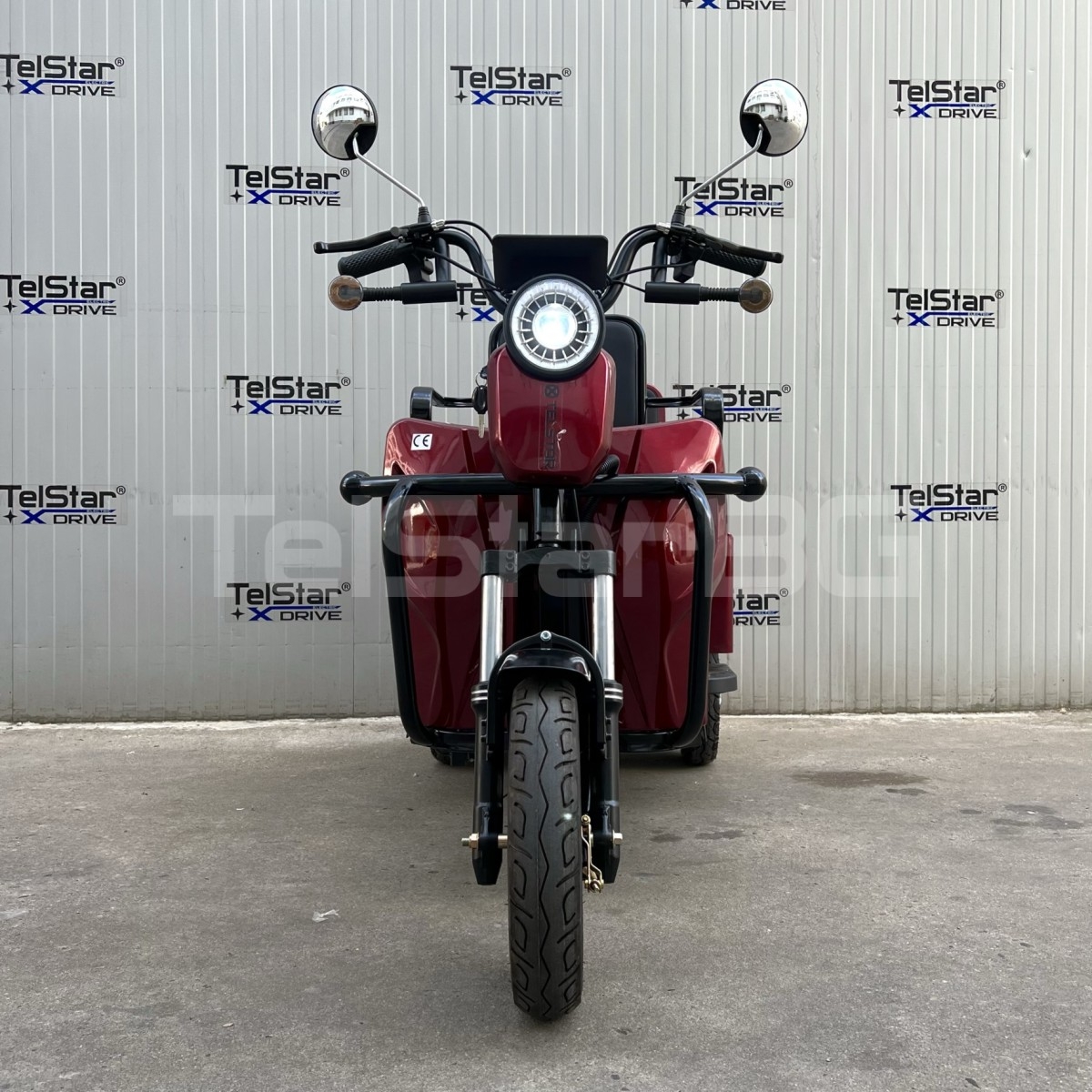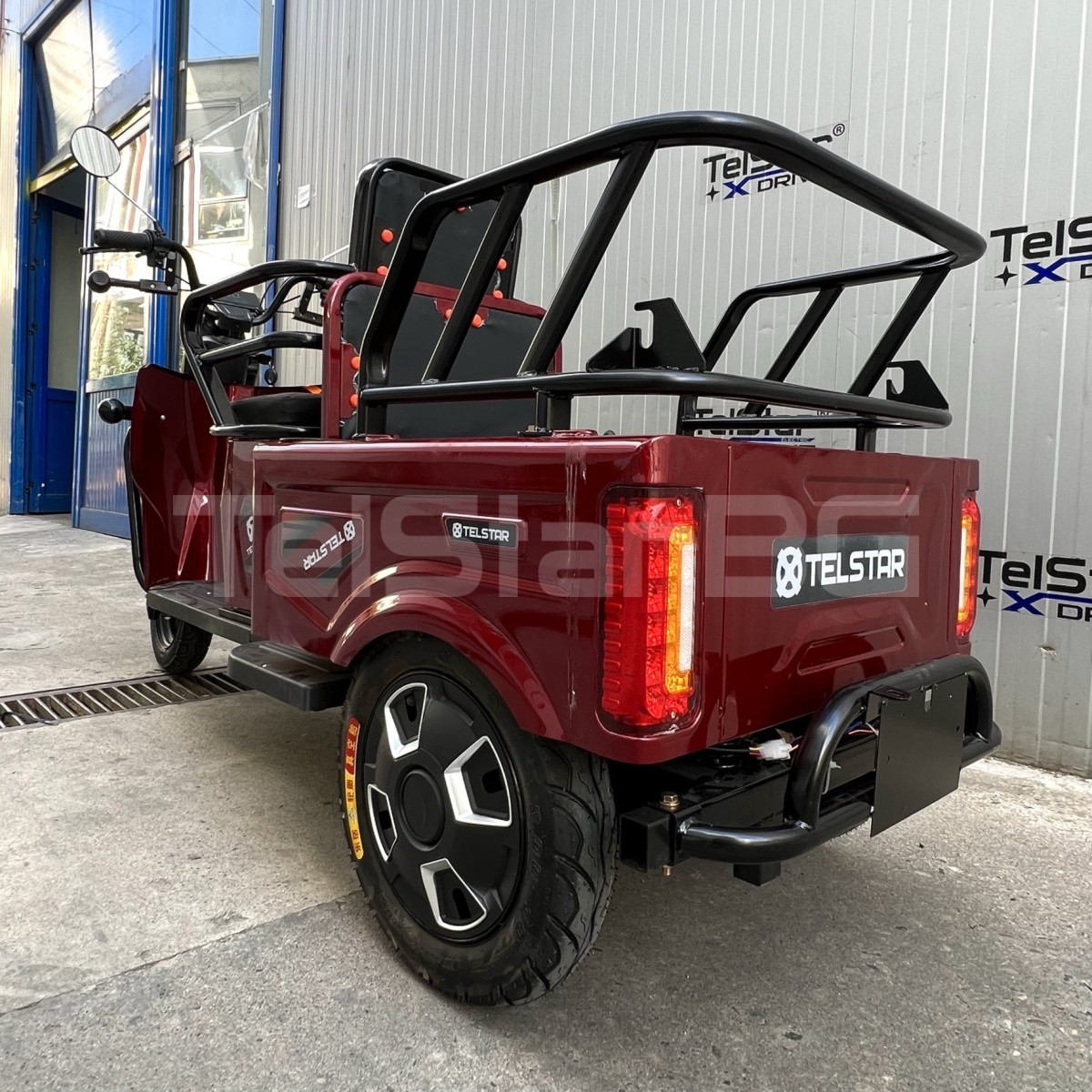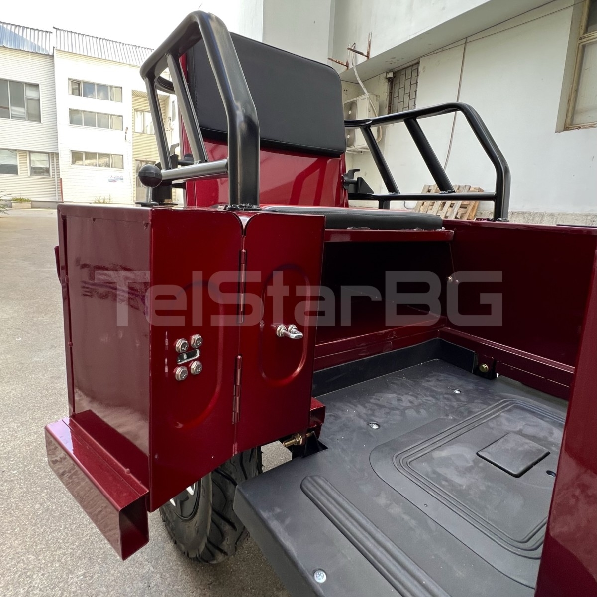 Оригинална електрическа триколка- две места + карго отделение с изключително висококачествена изработка. Задната седалка се превръща в удобно карго багажно отделение с 1 движение. Прахово нанасяне на боята по електролитна технология. Триколката се предлага и във вариант със лесна за монтаж и демонтаж покривна конструкция.