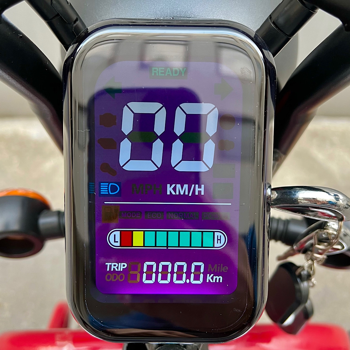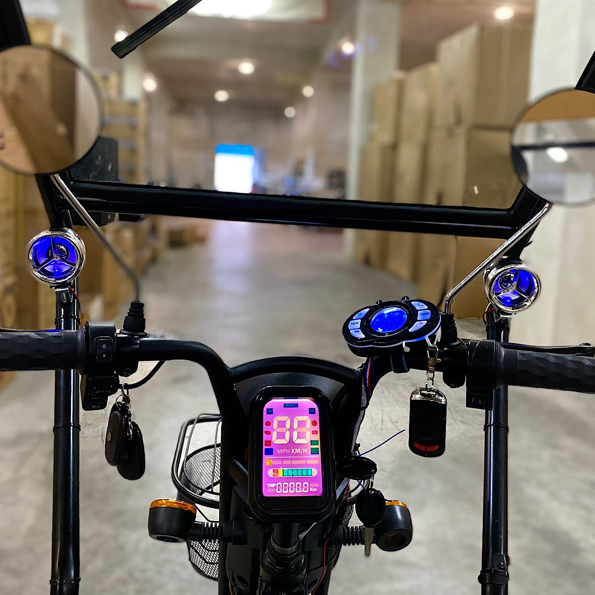 Допълнителна информация- пълна светлинна окомплектовка, фар, стоп, мигачи, габарити - мощен преден LED фар с нов дизайн - луксозна предна и задна кожена седалка с подлакътници - предна пазарска кошница - ГОЛЯМ дигитален LCD дисплей показващ над 5 параметъра - багажното отделение се заключва - багажно отделение под задната седалка - крачна спирачка - нов модел мощен контролер с плавен старт - балонни гуми подходящи за неравности - 3 скорости - задна скорост - клаксон - аларма - странични светлоотразители - Подарък- 2 бр. огледала за задно виждане + 2бр. дистанционни с аларма и безконтактно включване + предна пазарска кошница за пазаруване + ГОЛЯМА задна пазарска кошница за пазаруване