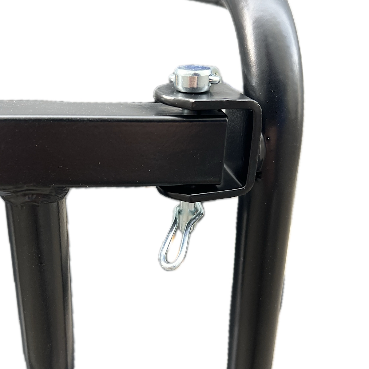 Лесно свързване и махане с помощта на предпазен щифт. Разполага с теглич с механизъм за бързо освобождаване и се закрепва лесно към превозното средство. Подвижната предна и задна врата дават възможност за лесно товарене и разтоварване на големи или неудобни предмети.